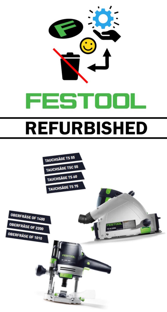 Das ist mal wieder eine tolle Initiative aus dem Hause FESTOOL – geben Sie Ihrem alten Werkzeug ein zweites Leben! Das gebrauchte Werkzeug in Zahlung geben und den berechneten Geldwert als Gutschein sichern, für ein neues Festool Werkzeug! Festool bereitet das gebrauchte Werkzeug auf und schenkt ihm, als „refurbished Produkt“, ein zweites Leben. Aktuell gilt die Festool-Aktion für alle Festool Tauchsägen und Festool Oberfräsen bis zu einem Gerätealter von 10 Jahren. So zumindest steht es zu lesen auf der Festool Website: