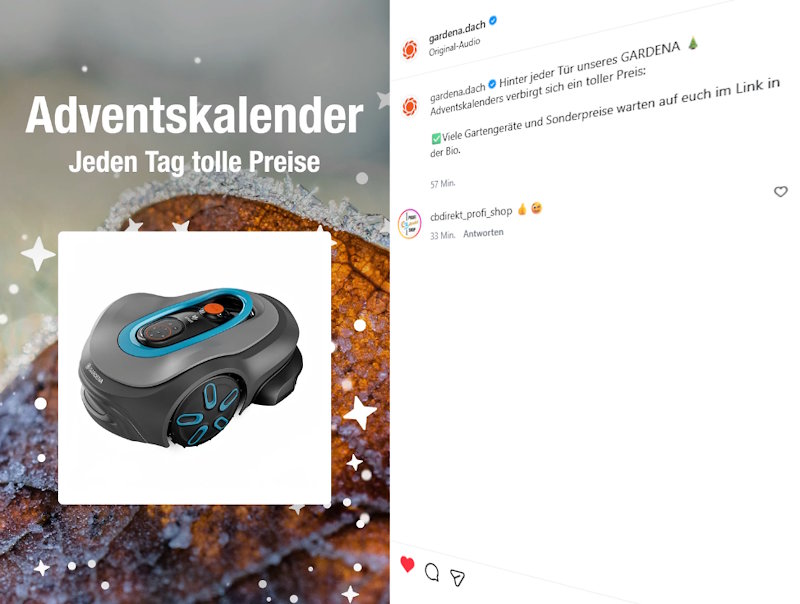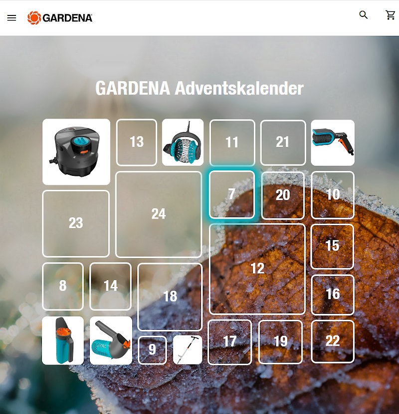 Hinter jeder Tür des GARDENA Adventskalenders verbirgt sich eine Überraschung, auf die es sich zu warten lohnt. Viele Gartengeräte und Sonderpreise für Gartenliebhaber und Gartenliebhaberinnen! So zumindest verspricht es Gardena auf der Gewinnspiel-Seite: